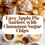 Crispy cinnamon sugar chips topped with tender cinnamon-spiced apples, a crunchy almond crumble, whipped cream, and a drizzle of caramel sauce make these Delicious Apple Pie Nachos a fun and delectable dessert that combines the flavors of classic apple pie with a playful twist.